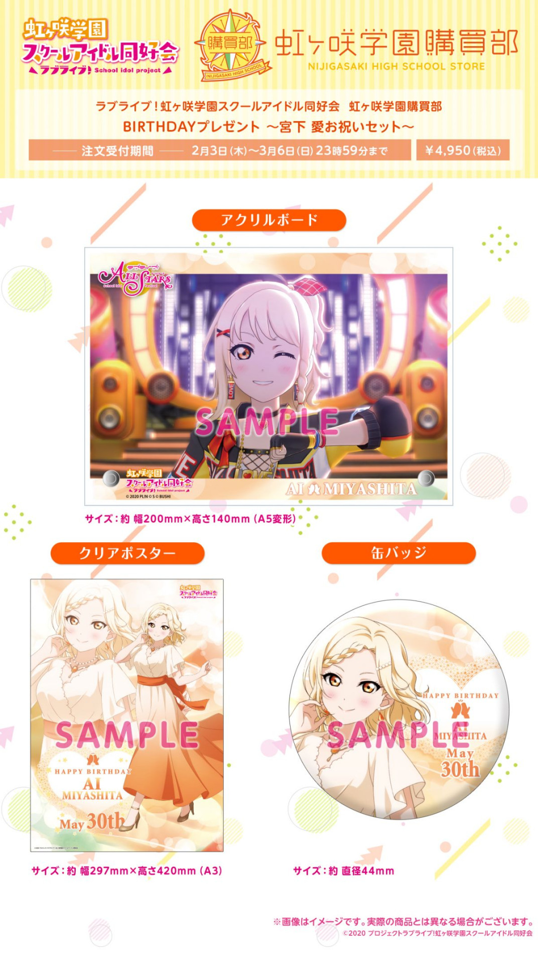 皆さんの投票で1位に選ばれたスクスタMVシーンを使用したA5アクリルボードと、新規描き下ろしイラストを使用したA3クリアポスター、缶バッジの3点セットを「BIRTHDAYプレゼント」として受注販売いたします。愛の誕生日に合わせてお届けします♪