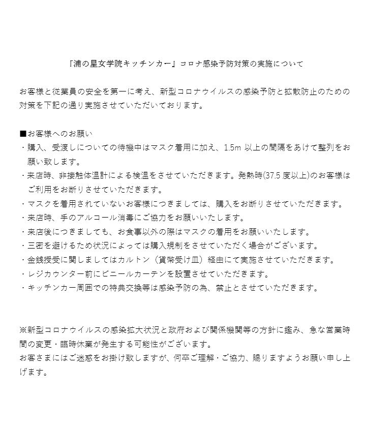 営業時間・場所等の詳細は今後随時ご案内致しますので、浦の星女学院キッチンカー公式twitterのチェックをお願いします。