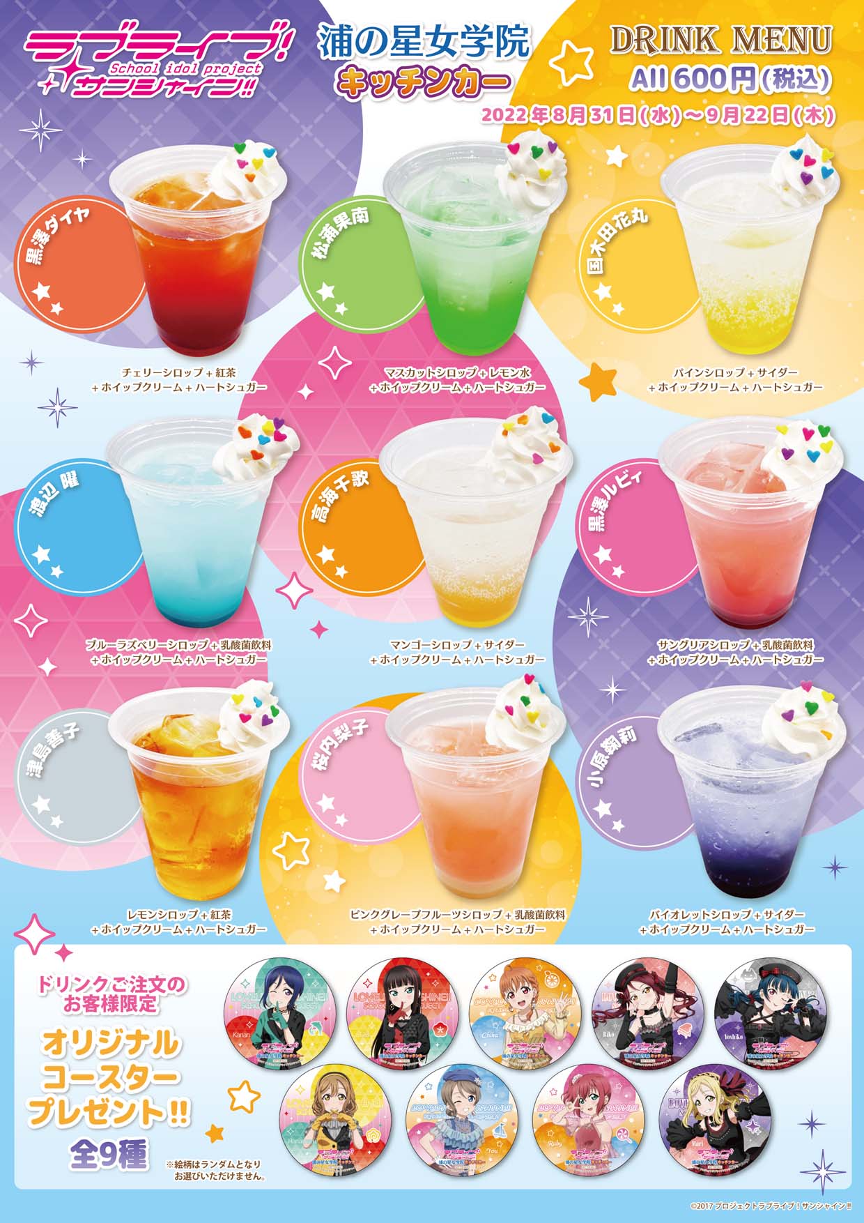 沼津エリアにて営業中の『浦の星女学院キッチンカー』ですが、この度ドリンクメニューが一新となり、特典のコースターも変更になります!